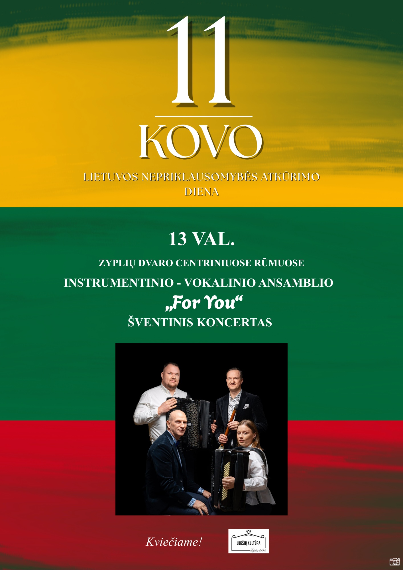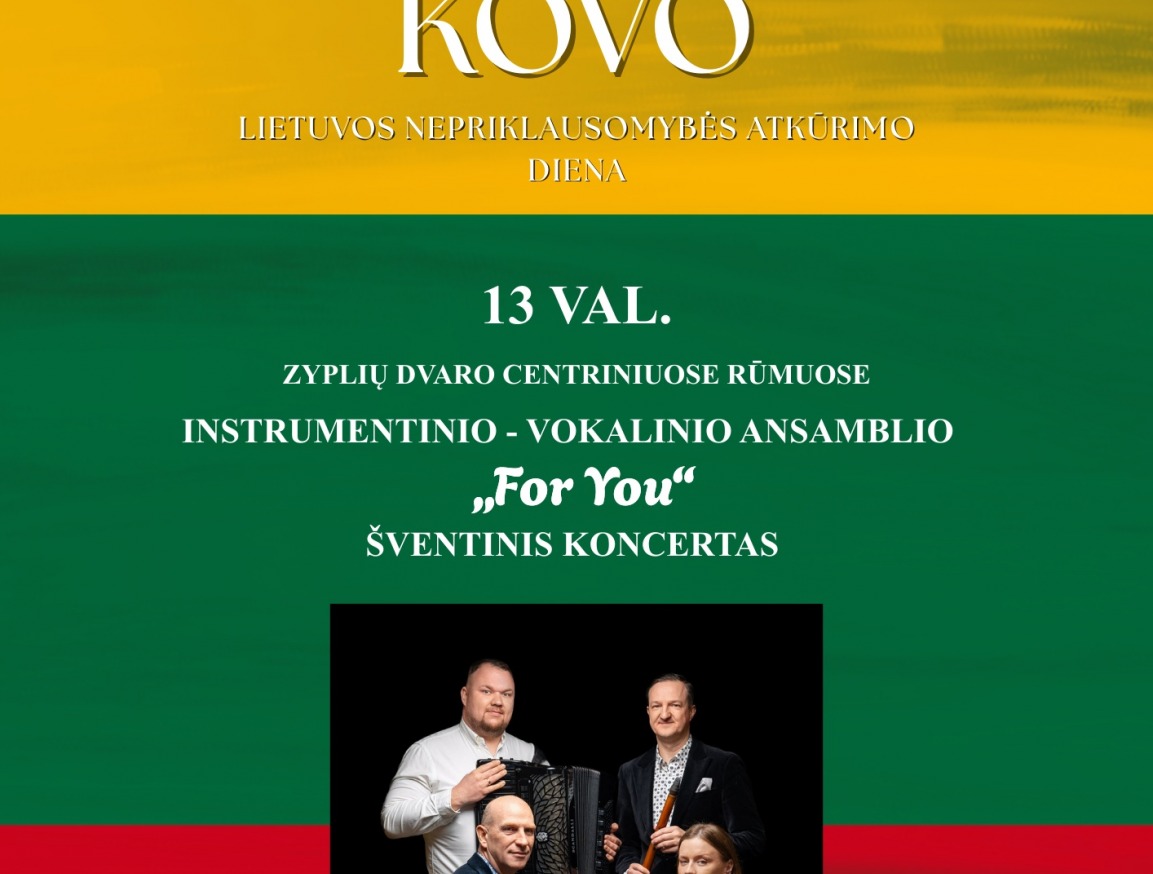 Kovo 11 d. 13 val. kviečiame Jus į Zyplių dvaro centrinius rūmus prasmingai paminėti Lietuvos nepriklausomybės atkūrimo dieną ir praleisti šventinę popietę muzikoje – kartu su gražiausiomis instrumentinio–vokalinio ansamblio „For you“ atliekamomis melodijomis.