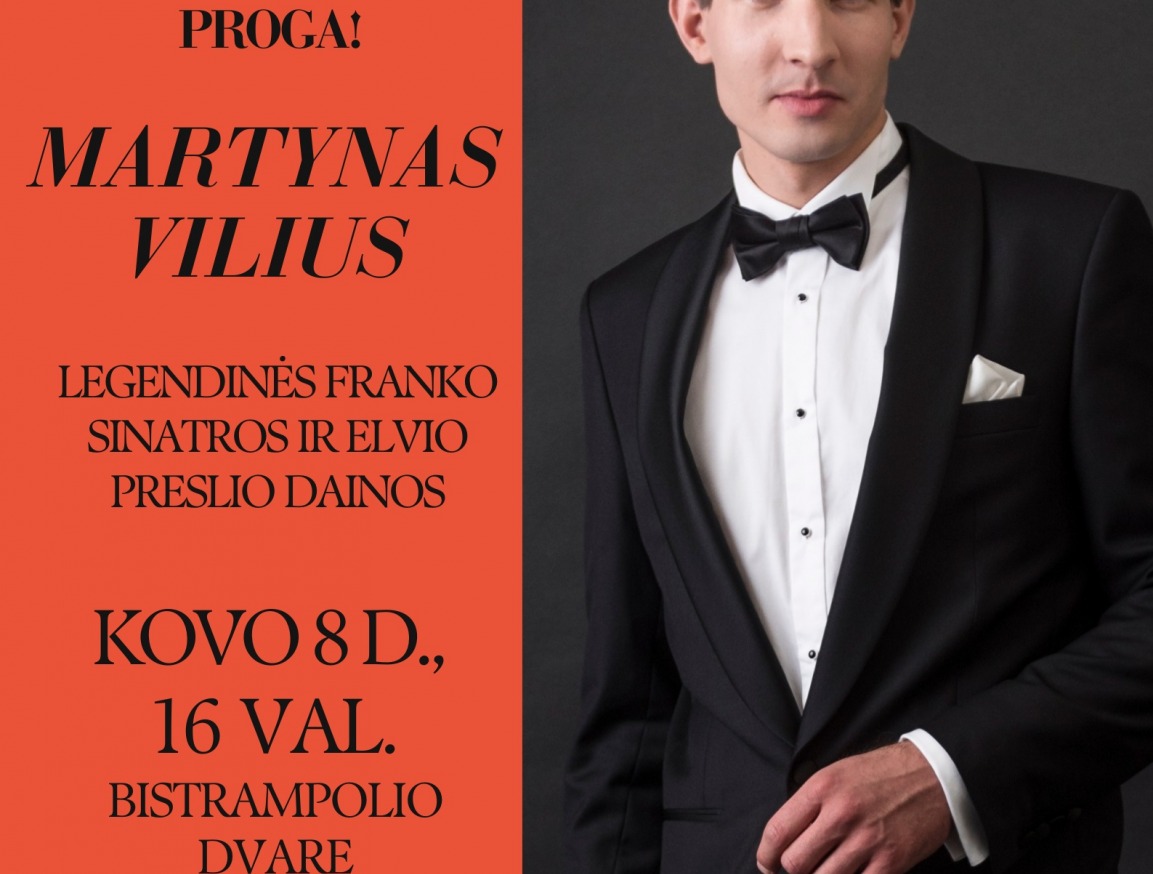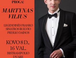 Kovo 8 d., 16 val. kviečiame į užburiančią svingo, rokenrolo ir jausmingų baladžių fiestą, kurią Jums dovanos vienas geriausių šalies dainininkų - Martynas Vilius, "Lietuvos balso" dalyvis, tarptautinio menų konkurso “Muzikos Talentų Lyga” I-osios vietos laimėtojas, garsėjantis iškirtiniu balso tembru, šiltu bendravimu su publika ir neišsenkančia energija scenoje. Kartu su Martynu Viliumi scenoje pasirodys vieni geriausių šalies muzikantų – fortepijono virtuozas Leonidas Mieldažis ir talentingasis perkusininkas Robertas Vilčinskas.